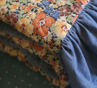 とっても素敵な柄なので1mまるまる使ってブランケットを作ってみました♪ 裏地のプードルボアはグレーなので落ち着いた雰囲気♪ フリルが付いてるので落ち着きの中に可愛らしさもありますよ♪